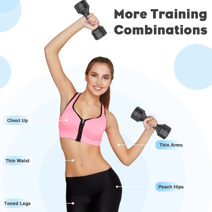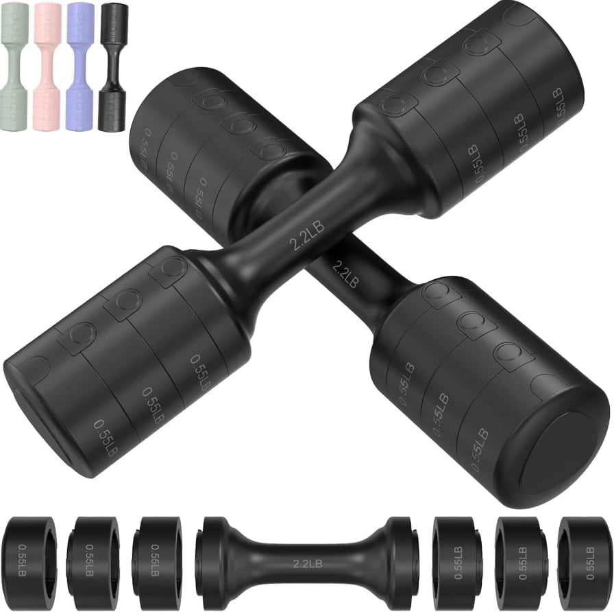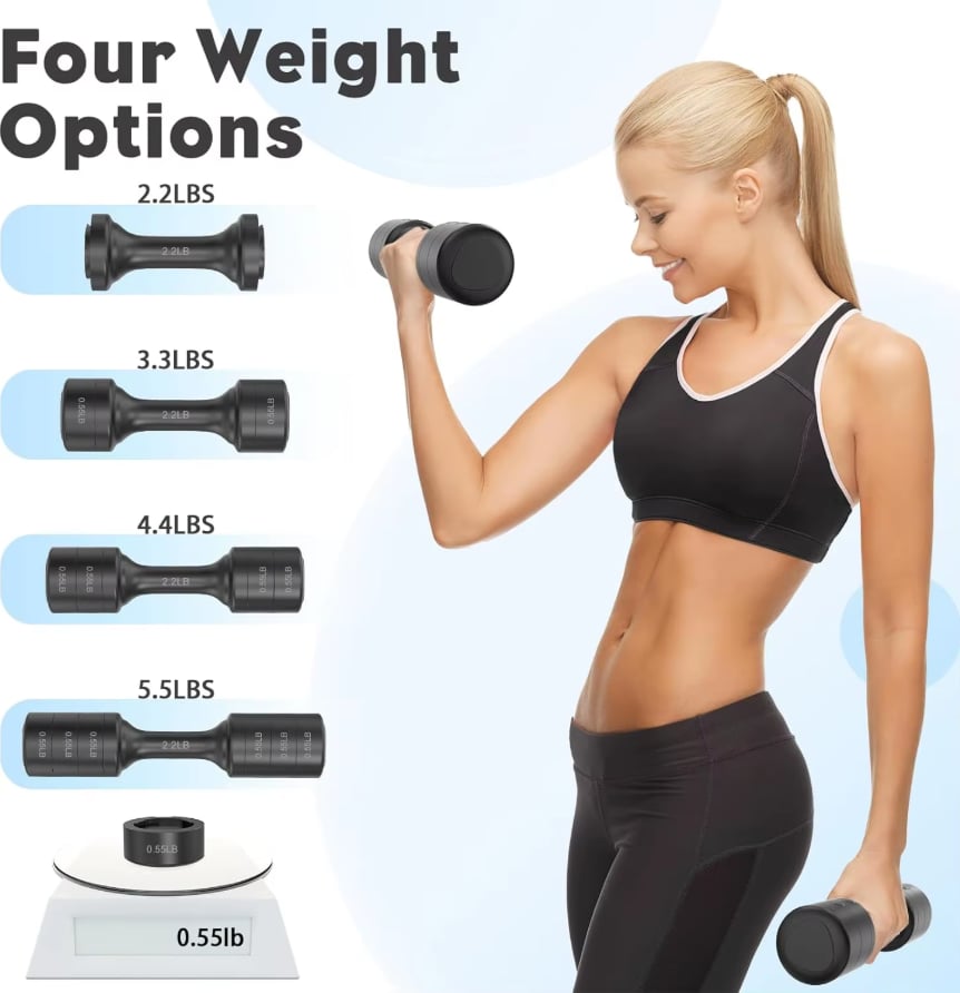 Each dumbbell set provides four distinct weight levels 2.2 lb, 3.3 lb, 4.4 lb, and 5.5 lb, allowing you to customize your workout intensity easily.